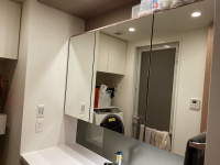 既存のオープン棚にミラー扉を取付て3面鏡にしました。 |
